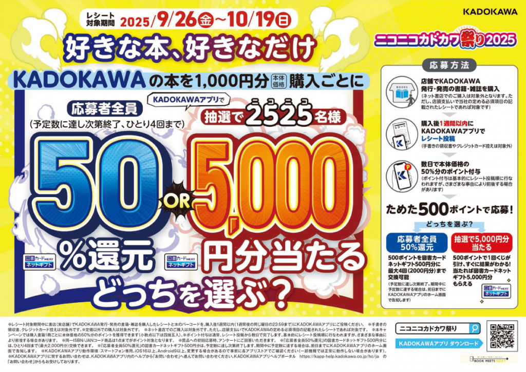 KADOKAWAの書籍・雑誌を書店にて購入いただくと、全員に50%還元 or 抽選で5,000円分の図書カードネットギフトが当たる還元キャンペーンや、豪華プレゼント企画に応募できます!