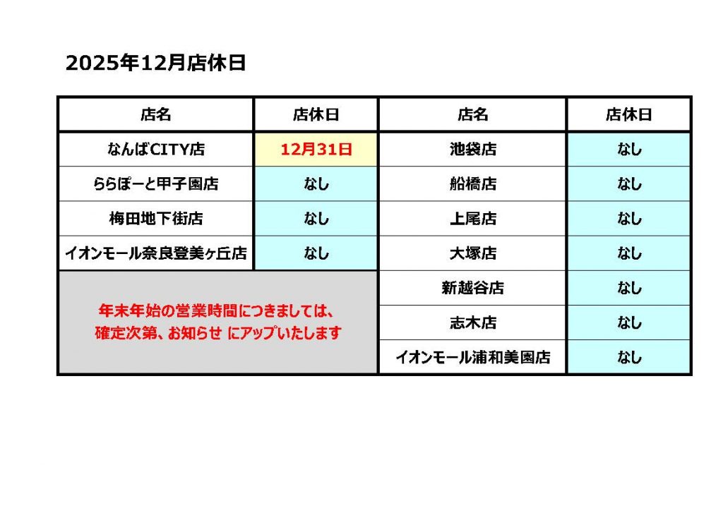 2025年12月の各店舗の店休日です。ご来店される店舗の店休日をご確認くださいませ。