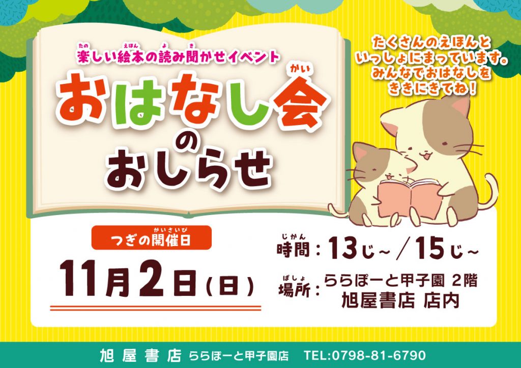 2025年11月最初の連休に、旭屋書店 ららぽーと甲子園店の店内にて絵本の読み聞かせ「おはなし会」を 実施いたします。